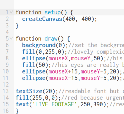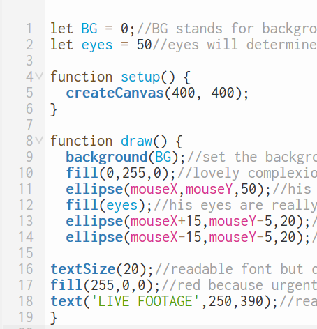 ^This code has some variables in it. They come before the setup and have assigned values to them. In coding = means assignment not equal! If you look in the code for ellipse it shows mouseX and mouseY. Previously these were set values but now track the mouse instead making them dynamic. You can also see additions and subtraction inside the ellipse code which are operators. Operators can change the location relative to its reference in this case the mouse.